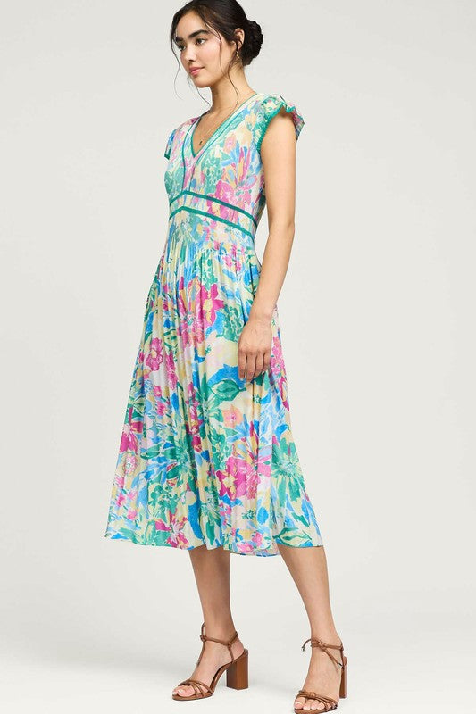 SAILOR V-NECK MIDI DRESS WITH PLEATED DETAIL
